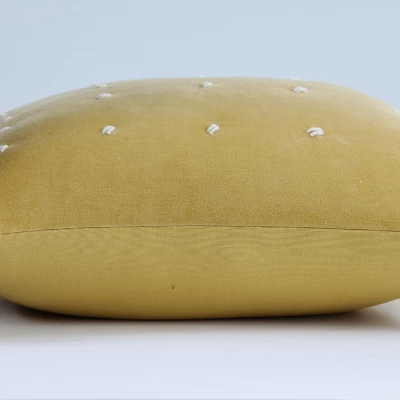 The Pillow Perfect Throw Pillow in French Knots Yellow is crafted from a cotton plush velvet and accented by French knots. The luxe feel of the velvet combined with the handmade knots give the pillow a polished feel that would be exceptional on your living room sofa or armchair. – the pillow can easily be paired with prints or complementary solids. The plush recycled polyester fill will maintain the pillow’s shape for years to come. Dry clean only as needed.