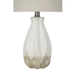 Illuminate your home with this transitional ceramic table lamp. The natural earthtones of the white and beige reactive glazed faceted body paired with an oatmeal linen shade makes for the perfect accent that blends with a variety of decor styles. The lamp is fitted with an easy and convenient on/off push switch. Try pairing them next to your bedside or favorite sofa to bring together a balanced and cohesive look.