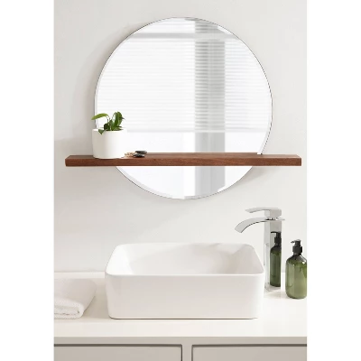 The unique Fossett mirror brings chic, midcentury modern style to your home with an uncomplicated and bold design. This wall mirror has an on-trend, round shape and a frameless design, elevated with a beveled edge to illuminate your space. But, that’s not all this mirror has to offer: it also features a sophisticated shelf with a minimal, floating design. Handcrafted in India, each piece in the Fossett collection has a unique finish and woodgrain from piece to piece. It’s constructed from high-quality glass and robust mango wood, built to last for multiple years of display. The round Fossett mirror stands out as a large focal point with a 24-inch diameter, while the floating shelf is 30 inches wide by 4.25 inches deep. The floating Fossett shelf is a fabulous way to showcase candles, small succulents, and other decorative accents. You can also use it as a functional storage utility for small household necessities! Whether you hang it in your living room, bathroom, bedroom, or entryway, the Fossett is easy to install with the metal keyhole hangers attached to the back.