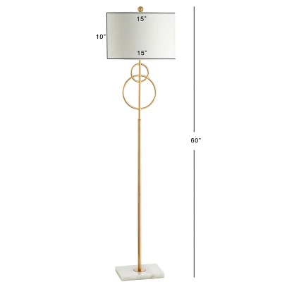 A modern classic, this stylish floor lamp has an open circle design and a brass-gold finish, anchored into a marble base. The rich marble and gold combination suits traditional and modern interiors. Quality details include a foot-step switch and silk-wrapped cord. A marble base adds an elegant touch. On-off foot-step switch. Eco-friendly 9W LED bulb included. Takes one bulb and compatible with any 12W LED or 100W TYPE “A” or 23W CFL. UL Listed. Before cleaning any lamp shade or fixture, disconnect the power source. Wipe with a soft, dry cloth. Avoid the use of chemicals and household cleaners as they may damage the finish.