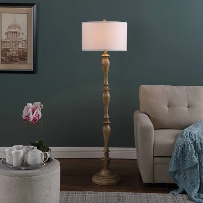 Embrace a relaxed, rustic aesthetic with this lovely antique cream candlestick floor lamp. From the sturdy round base to the cotton/linen drum shade, you’ll love the shapes and light tones of this country-cottage column floor lamp. This striking rustic candlestick floor lamp is just the boost your living area seeks. A mix of delicate shapes and curves combine with rustic weathered tones, Column support gracefully incorporates circulars, teardrops, and ovals in a lovely rustic antique cream finish over polyresin construction. Its country-cottage look is perfectly accented with a linen softback drum shade for excellent illumination in a bedroom or home office. This lamp will bring a cozy appeal to any transitional or rustic style home.