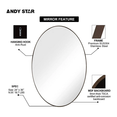 Start the day off with a mirror that matches your style. Enhance the modernity of your household with the ANDY STAR 24 x 36-Inch Oval Wall Hanging Bathroom Mirror.This oval-shaped mirror is sure to bring a sophisticated accent to any living area. Quality is in the details, from a refined brushed bronze finish, precise linework, and the gap between the frame and glass. This mirror presents beautifully under high-definition floating glass and medium-density fiberboard with no visual distortion. A broad oval shape offers increased vertical visibility so you can get an unobscured look at your reflection before the day begins. The heavy-duty, 2-millimeter stainless steel frame with multiple layers of waterproofing allows for a luxury appearance boasting long-lasting durability. This modern hanging mirror is rated for use in the bathroom, fireplace, entryway, living room, and other high-moisture areas.For all-in-1 convenience, all mounting hardware for installation is included. Perfect for refining you or your household’s aesthetic, the ANDY STAR Oval Wall Hanging Bathroom Mirror is the high-end mirror you need to reinvent your daily routine.
