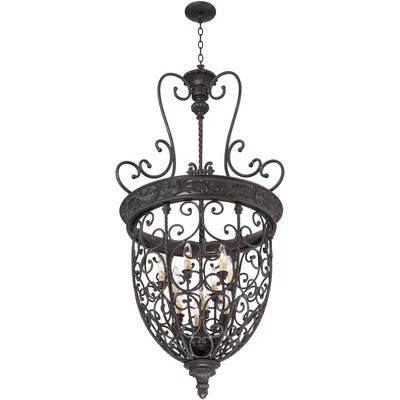 With elegant scrolls and an open look, this large foyer chandelier lends beautiful style to entryways, foyer spaces, and large rooms. The design features an iron-look ornate frame with twelve lights clustered inside. Delicate metalwork connects decorative top scrolls with the main lower section. Add old world elegance and panache to your home with this grand chandelier.