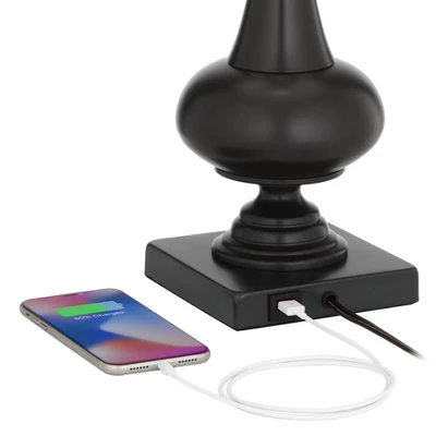 This set of two handsome table lamps offers a warm, inviting touch for your home. Each lamp features arresting curves atop a square base in a handsome bronze finish over a metal frame. A rich faux leather tapered drum shade tops each lamp for a further element of style, while the base USB ports add a contemporary touch to keep your devices fully charged.