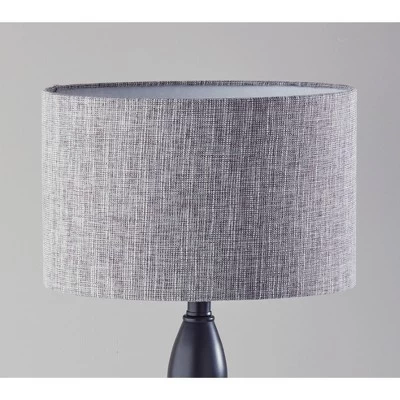 - Black metal finish is complemented by the dark gray and white textured fabric shade.